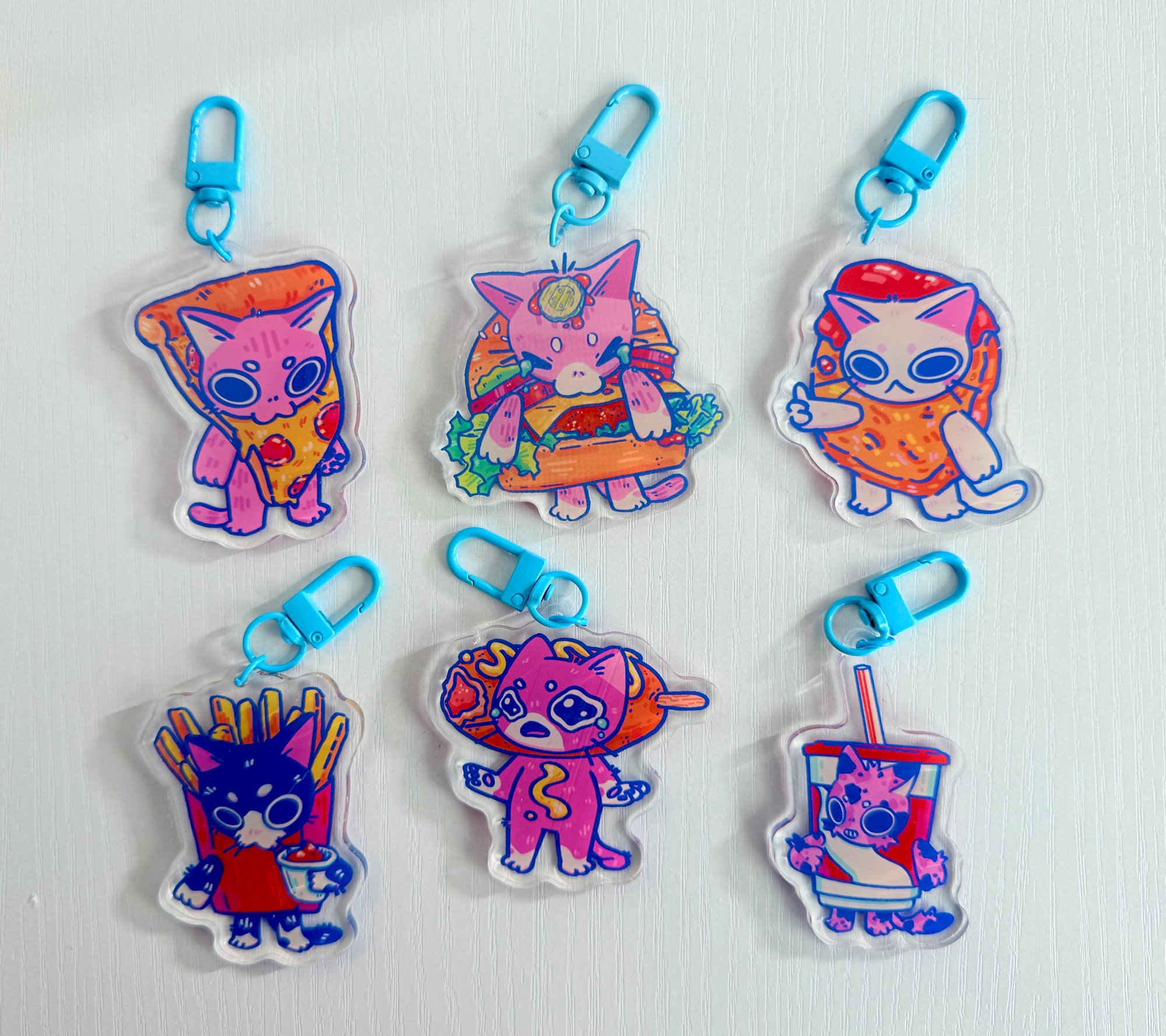 Fast Food Cat Acrylic Keychains, bag charms, Cat art, Catburger, fries, corndog